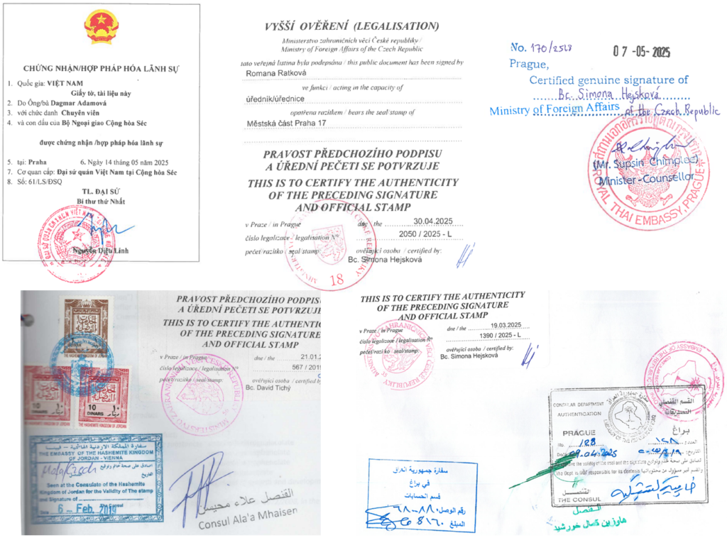 • Nakonec listinu ověří zastupitelský úřad cizího státu (velvyslanectví, konzulární oddělení, honorární konzulát) vykonávající působnost pro Českou republiku.