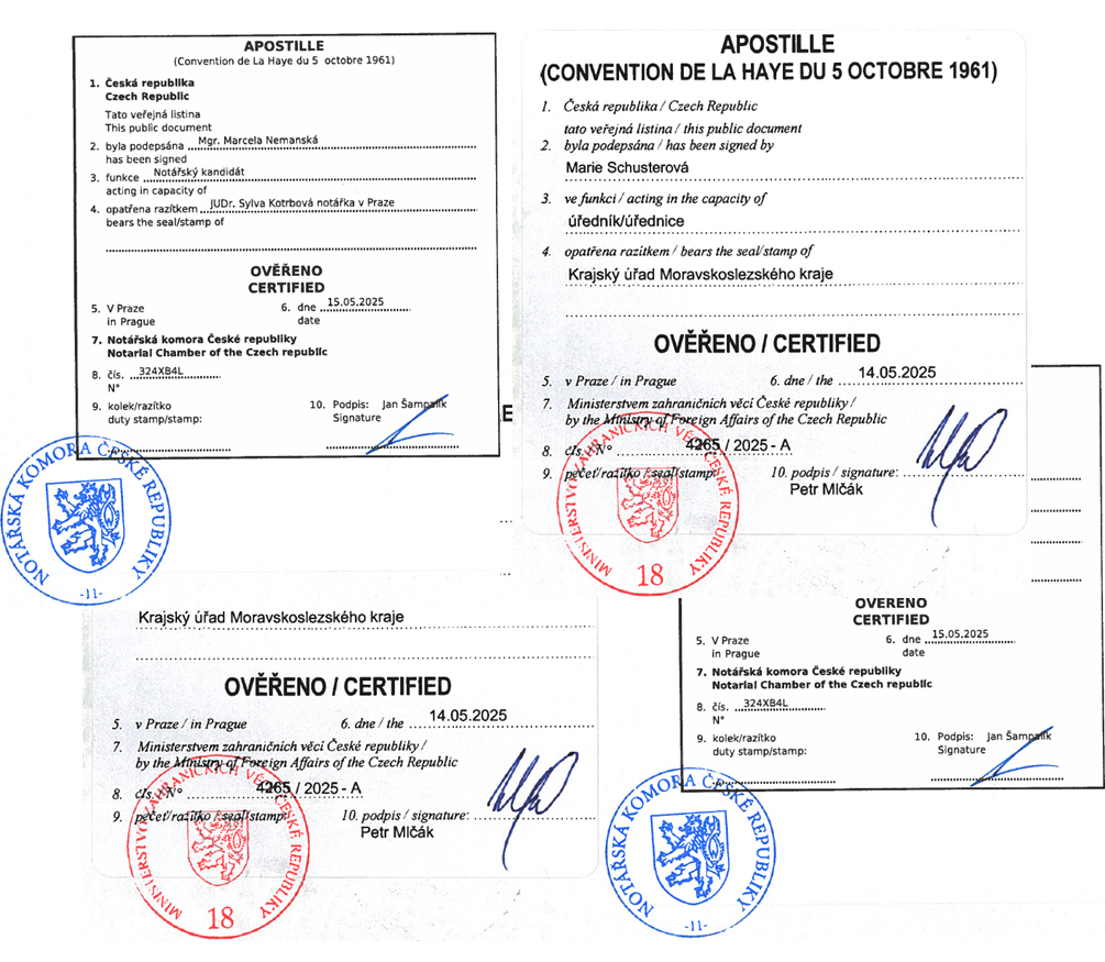 • An apostille may also be issued for a document in a language other than Czech, provided that it bears the required certifications by Czech authorities.